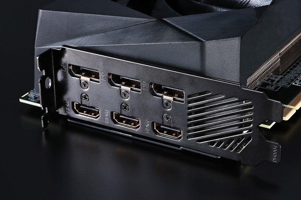 第2世代のRTXアーキテクチャー「Ampere」採用の最新GPU「NVIDIA GeForce RTX 3070」を搭載した「AORUS GeForce RTX 3070 MASTER 8G」は、PCI Express 3スロット分のスペースを占有する大型グラフィックボードだ。映像出力端子としてDisplayPort×3、HDMIポート×3を搭載し、変換アダプターを用いることなく、多数のディスプレイへ映像出力が可能だ(GPUの仕様上、同時映像出力数は最大4つ)
