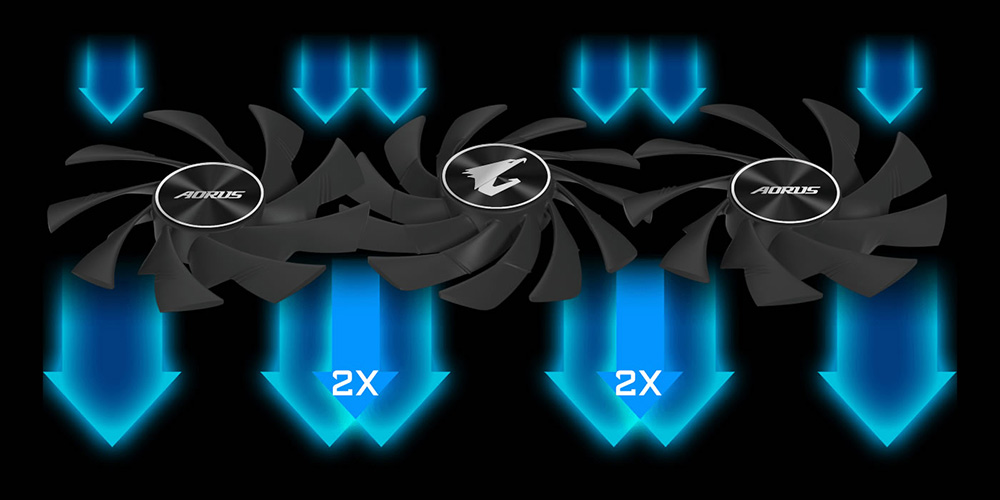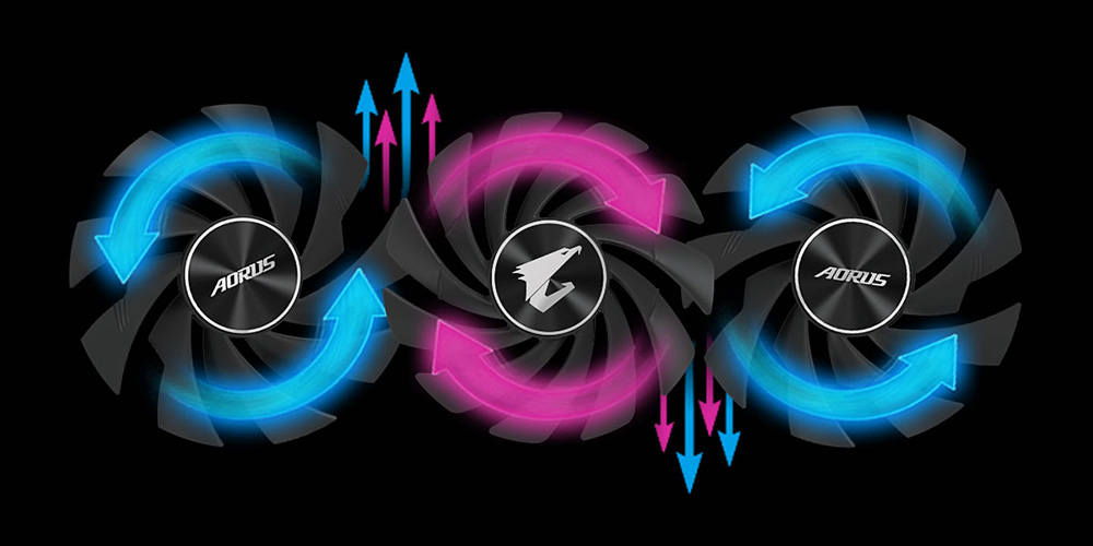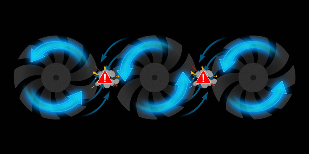 複数のファンが同じ方向に回転する一般的な冷却ファン機構では、隣接するファンの間に乱気流が発生し、十分な冷却性能を発揮できない。この課題を解決するため、「Max-Coveredクーリング」では中央のファンを逆回転させる「オルタネートスピニング」を採用。乱気流が減るのはもちろん、風圧が高まり、冷却効果が増すのだ