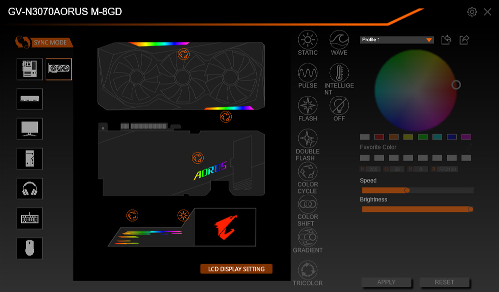 最近のゲーミングパーツは光による演出を楽しめるものが多いが、「AORUS GeForce RTX 3070 MASTER 8G」においてもこうした楽しみ方が可能だ。フルカラー表示が可能なLEDがグラフィックボード上の5か所に設置されており、LED統合制御ソフト「GIGABYTE RGB Fusion 2.0」を使って発光カラーや発光パターンを個別にカスタマイズできる。