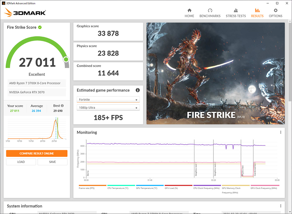最後に、気になる本機のパフォーマンスをチェックしていこう。本機は、「DLSS AIアクセラレーション」や「リアルタイムレイトレーシング」などの性能がアップした第2世代RTXアーキテクチャー「Ampere」を採用したハイクラスGPU「NVIDIA GeForce RTX 3070」を搭載。しかも、動作クロックはリファレンスカードの1725MHzを超える1845MHzにオーバークロックされているので、よりパワフルな処理性能を発揮してくれるはずだ。