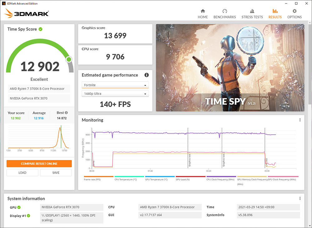 こちらは、グラフィック性能を計測するベンチマークプログラム「3DMark」の結果。DirectX 11対応ゲームを想定した「Fire Strike」は27011、DirectX 12対応ゲームを想定した「Time Spy」は12902と、最先端のゲームパフォーマンスを備えていることがわかる