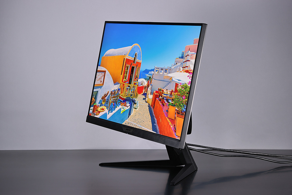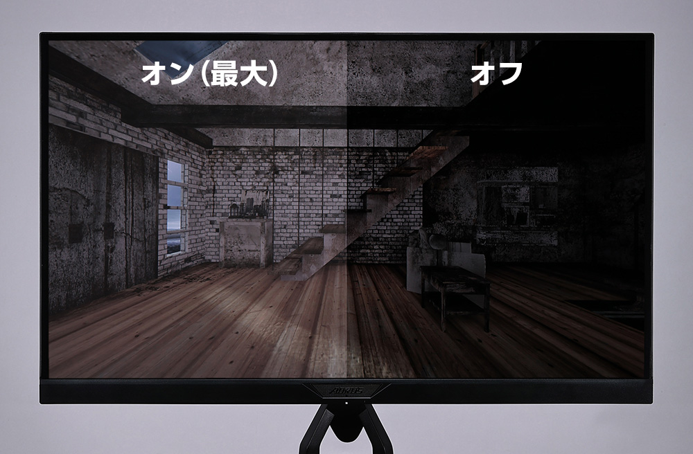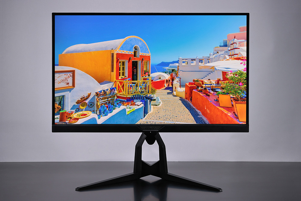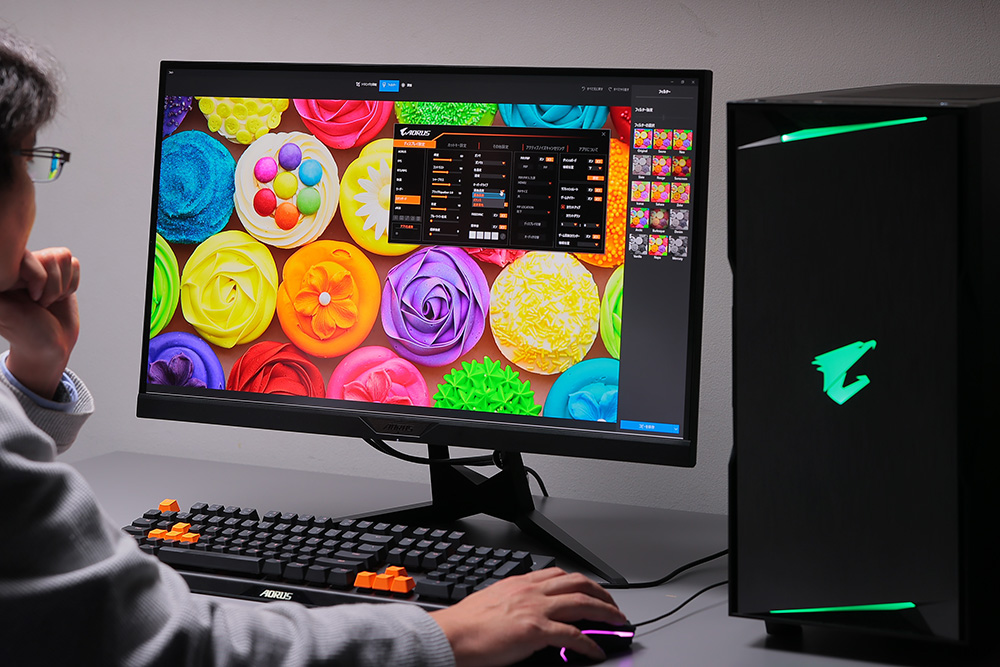 Super Speed IPSパネルを採用した「AORUS FI27Q-X」は、AdobeRGBで100%、sRGBに至っては142%カバーするほどの高い色再現性を備えている。10ビット(8ビット+FRC)表示や「DisplayHDR 400」にも対応しているので、表示の美しさはプロのクリエイティブ環境でも十分使えるレベルにある。また、Super Speed IPSパネルは視野角が広く、ほぼ真横から見ても明るさやコントラストが落ちないのも魅力だ