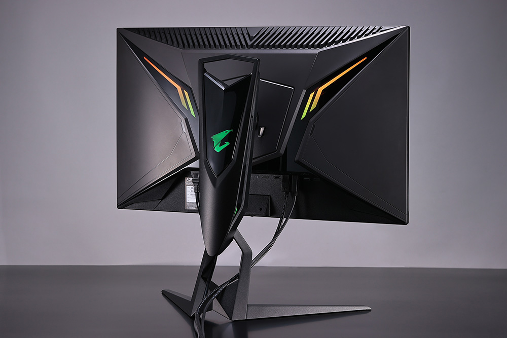 続いて、「AORUS FI27Q-X」の外装をチェックしていこう。背面デザインは、翼を広げたハヤブサをモチーフとしたもの。ディスプレイを支えるスタンド背面の「AORUS」ロゴと左右の翼部分にLEDを内蔵しており、発光が可能だ。発光カラーや発光パターンは、LED統合制御ソフト「GIGABYTE RGB Fusion 2.0」を使って制御できる。
