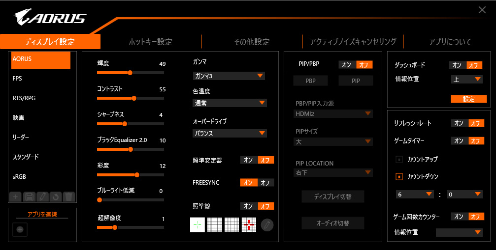 専用のユーティリティソフト「OSDサイドキック」をパソコンにインストールして、「AORUS FI27Q-X」とUSB接続すれば、OSDメニューをパソコン上で操作できるのもありがたい。行った設定はリアルタイムに反映されるため、画質調整が行いやすかった