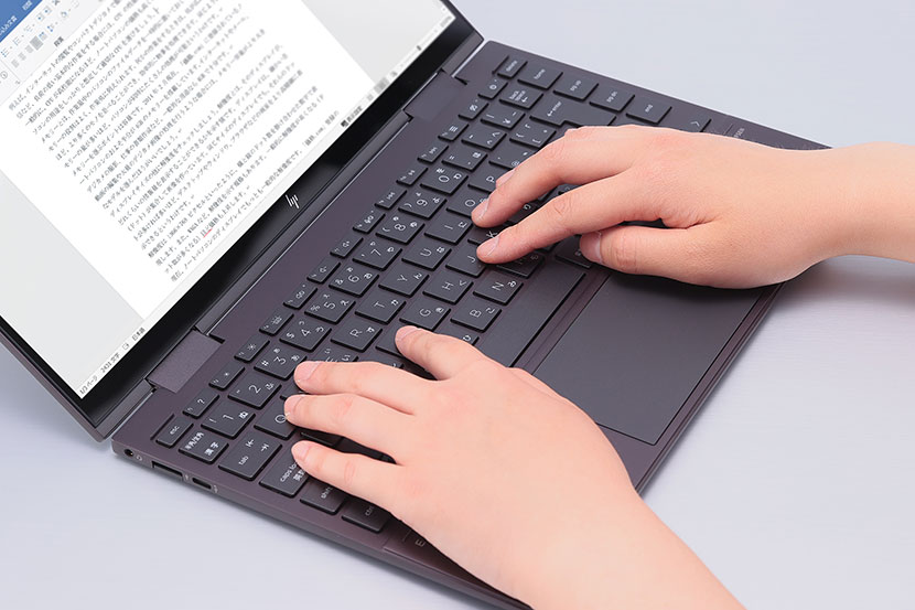 まずは見た目のデザインだが、実物を目の前にしてまず驚いたのは、フットプリント(接地面積)の小ささ。狭額ベゼルを用いた画面占有率約88%のディスプレイを採用することで、13.3型は一般的な11.6型のノートPCと、15.6型は一般的な14型のノートPCと、それぞれワンランク小型のモデルとほぼ同等のフットプリントを実現しているのだ。フットプリントが小さいので、カフェや新幹線の車内など、狭いテーブルの上でも作業しやすいだろう。また、「HP ENVY x360」の特徴のひとつともなっているアルミニウム削り出しのボディは、高級感が漂い、質感・剛性ともに高い。これなら、外出先でも人目をはばかることなくパソコンを広げることができるし、急いでいる時に少々乱暴にカバンに収納しても安心だ。