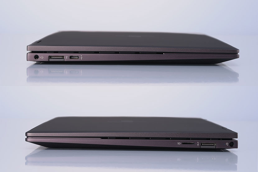 上左右だけでなく、液晶下部のベゼルも細くした4辺狭額縁デザインによって、ボディの幅と奥行をできる限り短くしている。これによって13.3型は一般的な11.6型ノートPCと、15.6型は一般的な14型ノートPCとほぼ同等のフットプリント(接地面積)を実現。カフェなどの狭いテーブルの上でも作業しやすい