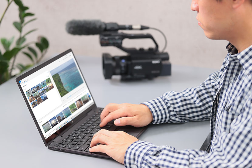 続いて、「HP ENVY x360」の処理性能をチェックしていこう。今回検証に使用したのは、AMDの「Ryzen™」プロセッサーの第3世代にあたる「AMD Ryzen™ 5 4500U」を中心に、8GBメモリー、高速なNVMe接続の256GB SSDを備えた13.3型の「スタンダードモデル」。メインマシンとして多用途で使用するにおいて不足のない構成のモデルだ。実際、パソコンの総合的な処理性能を測る定番のベンチマークプログラム「PCMark 10」を実行したところ、一般的な使用を想定した「Essential」テスト、ビジネスアプリの使用を想定した「Productivity」テスト、写真や動画の編集作業を想定した「Digital Contents Creation」テストのすべての項目で快適さの目安となるスコアをクリアした。また、実使用においてもパフォーマンスに不満はなく、パソコンの起動やスリープからの復帰も数秒で終わるうえ、動画のエンコードやマルチタスク作業など、パソコンに負荷のかかる作業もサクサク快適に行えた。普段使いからクリエイティブ作業まで、幅広い用途で活躍してくれそうだ。