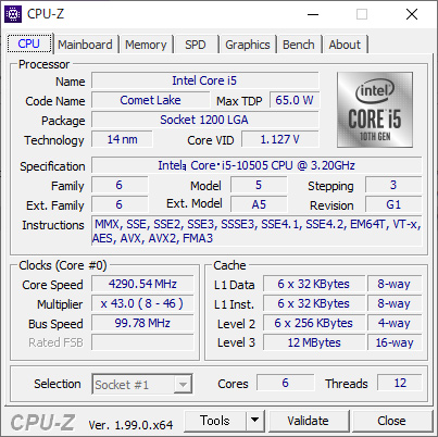CPU | 第10世代 インテル Core i5-10505 プロセッサー(6 コア、3.2GHz-最大4.6GHz) |