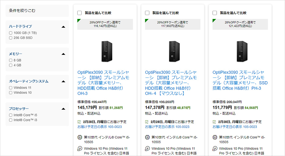 また、「OptiPlex 3090 SFF」は“即納モデル”なのも魅力のひとつだ。法人向けPCは受注生産で販売されることがほとんどで、注文から納品まで数週間かかることもザラにある。その点、本機は早ければ数日で届く即納モデルなので、急にスタッフが増えた時や急にPCが必要になった時もすぐにPCを用意することができるのだ。なお、即納モデルではなくなってしまうが、CPUやメモリー容量、ストレージ容量などをBTOメニューからカスタマイズすることも可能だ。