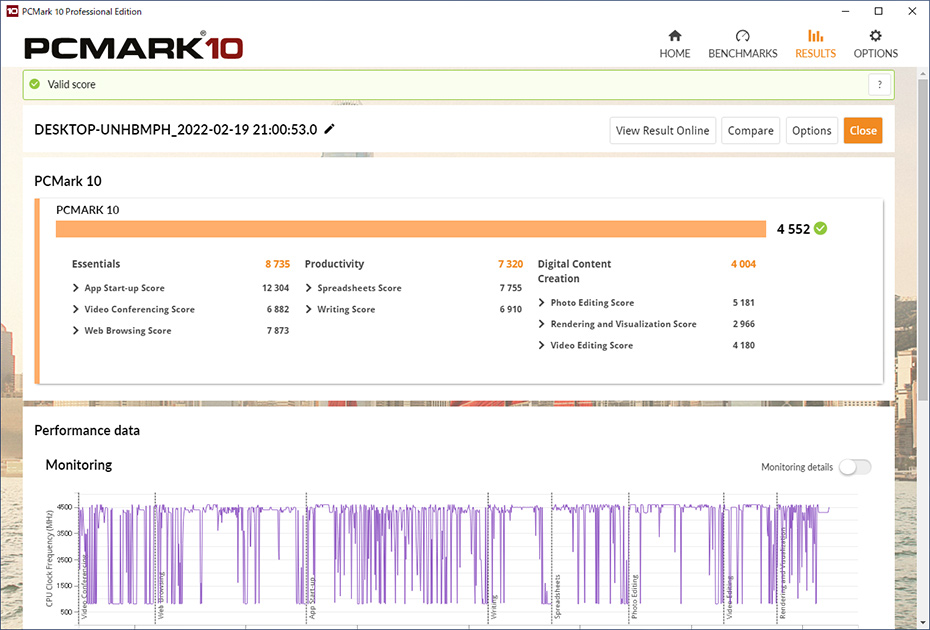パソコンの総合性能を測定する定番ベンチマークプログラム「PCMark 10」(UL)で計測したところ、オフィスワーク用PCとしてどれだけ快適に動作するかの指標である「Productivity」のスコアは「7320」。オフィスワーク用PCの推奨値となる「4500」を大きく上回った。これなら仕事用PCとして、さまざまな作業を余裕でこなせるだろう。