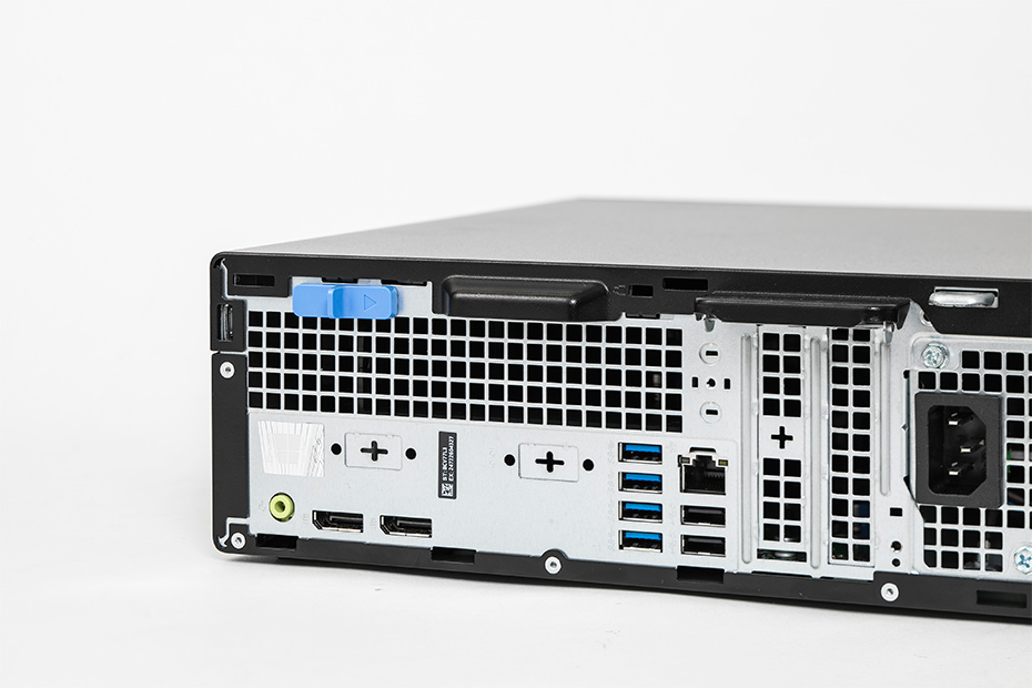 コンパクトな筐体ながら拡張性は高い。USB2.0ポートは前面と背面に2基ずつ、USB 3.0ポートは背面に4基あり、USBポートは合計8基も備えている。映像出力端子はDisplayPortを2基、VGAポートを1基搭載している(※写真はDisplayPort×2のモデル)