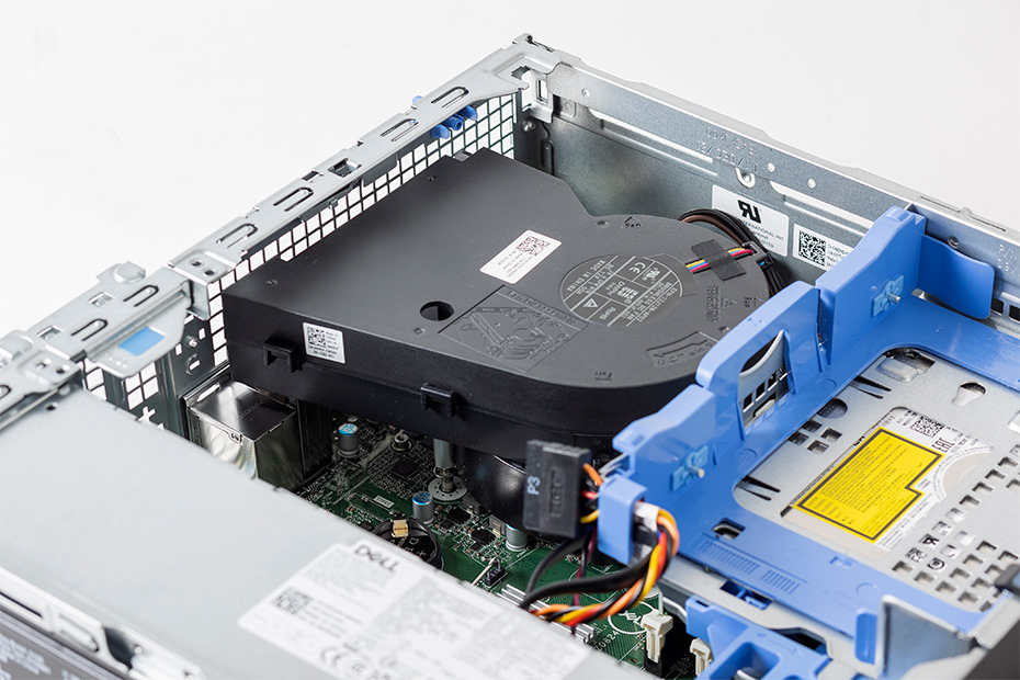さらに、内部構造にも工夫がある。筐体がコンパクトなPCの弱点として、内部に熱がこもりシステム自体の温度が上がりやすいことがあげられる。温度が上がり過ぎれば、PCの性能を十分に発揮できないうえ、故障の原因にもなりかねない。そこで、「OptiPlex 3090 SFF」では、CPUクーラーを外部排気仕様にしているのだ。一般的なパソコンでは、給気ファンで外から取り込んだ空気をヒートシンクに吹き付けるようにして冷却するが、この方法ではPC内部に暖かい空気が残ってしまうため、別途排気機構が必要になる。そこで本機は、CPUクーラーのファンで直接外部に温かい空気を排気する仕組みを採用。構造をシンプルにしつつPC内の温度上昇を抑えられるというわけだ。