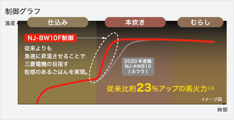 - ※3 仕込み(予熱)終了から沸騰までの平均電力比較。NJ-BW10F:約950W、2020年度製NJ-AWB10:約770W。