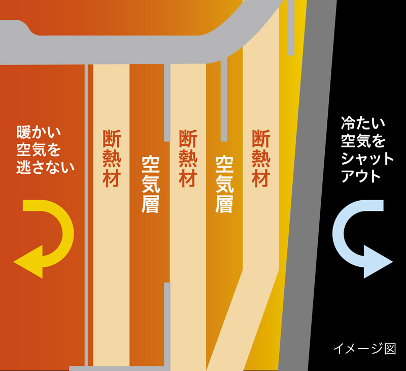 従来モデル(NJ-AWB10)の本体断面には空気層を断熱材で挟み込む「3層断熱層」が採用されていたが、「本炭釜 紬(つむぎ) NJ-BW10F」では「断熱材+空気断熱層」で構成された「5層断熱層」を採用。熱を逃さずに大火力を維持できるようになっている