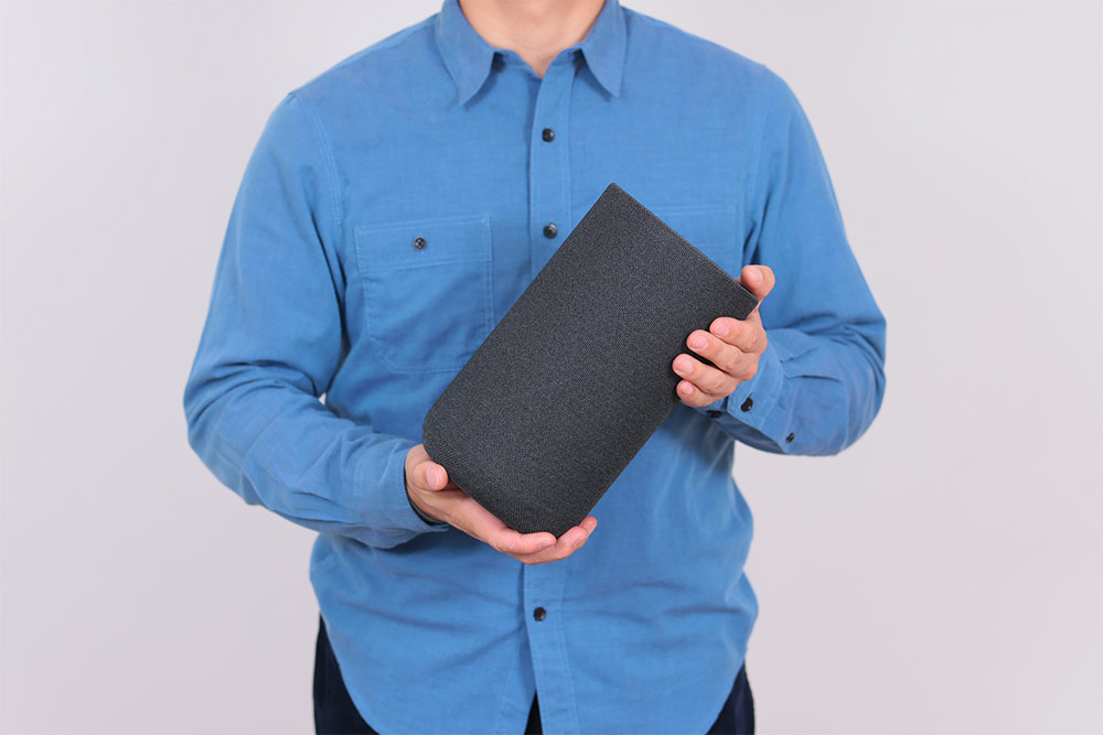 145(幅)×250(高さ)×134(奥行)mm(突起部除く)とコンパクトなうえ、ファブリック素材を採用することで、インテリアに溶け込みやすいデザインになった「SA-RS5」。この小型ボディに、イネーブルドスピーカーや高性能なアンプを搭載させ、さらに約10時間使用できるバッテリーを内蔵させるには多くの困難があったとのこと。とはいえ、ソニーならではのノウハウやテクノロジーを活用することで、サイズと音質、そしてバッテリー駆動時間の適切なバランスを実現したという