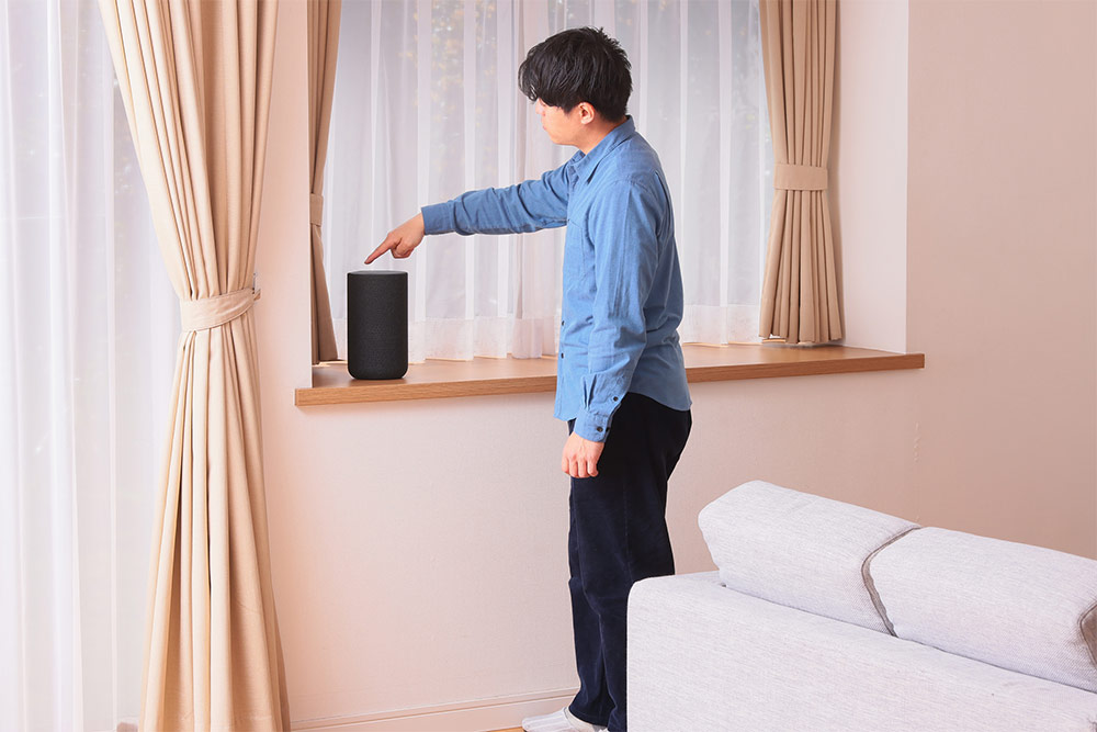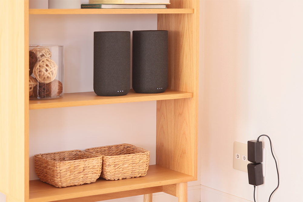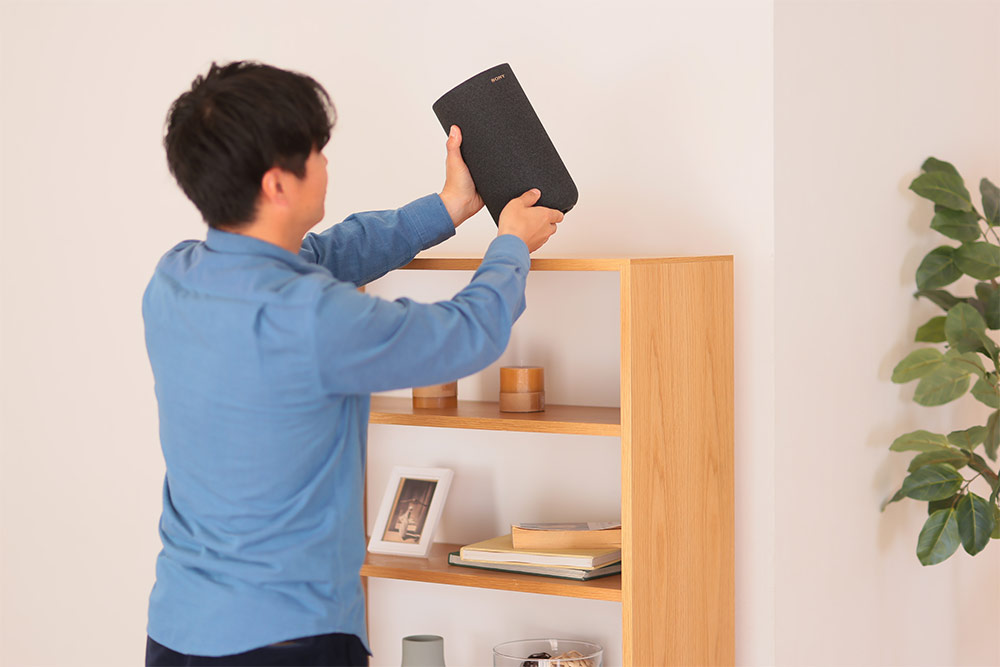 実際に「SA-RS5」を設置していこう。一般的なリアスピーカーは最適な設置場所を見つけることがまず難しいが、本機は高さや距離を選ばないので、基本的にはどこでも設置できる。今回は、右側スピーカーを背の高い棚の上のスペースに、左側スピーカーを背の低い棚の上の空きスペースに設置。このように、空いているスペースに置くだけで利用できる手軽さは「SA-RS5」ならではの利点だ