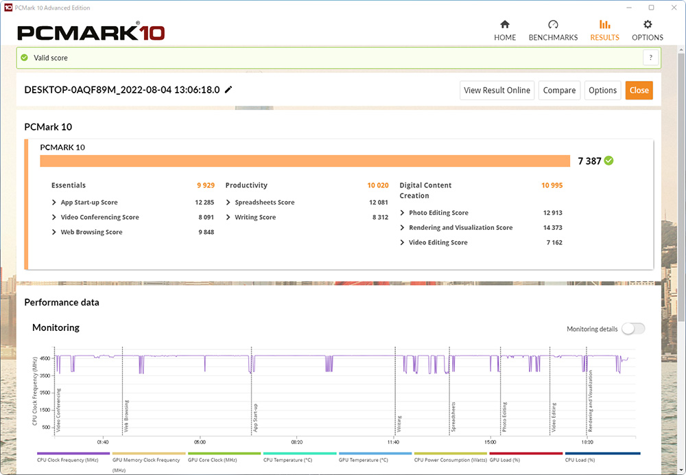 パソコンの総合的な性能をチェックする定番ベンチマークプログラム「PCMark 10」を試したところ、ハイエンドモデルの目安である7000を超える7387をマークした。ビジネス系アプリ使用時の快適さを示す「Productivity」や、クリエイティブアプリでの性能を示す「Digital Content Creation」は10000を超えており、ゲーム以外のさまざまな作業も快適に行えることがわかる