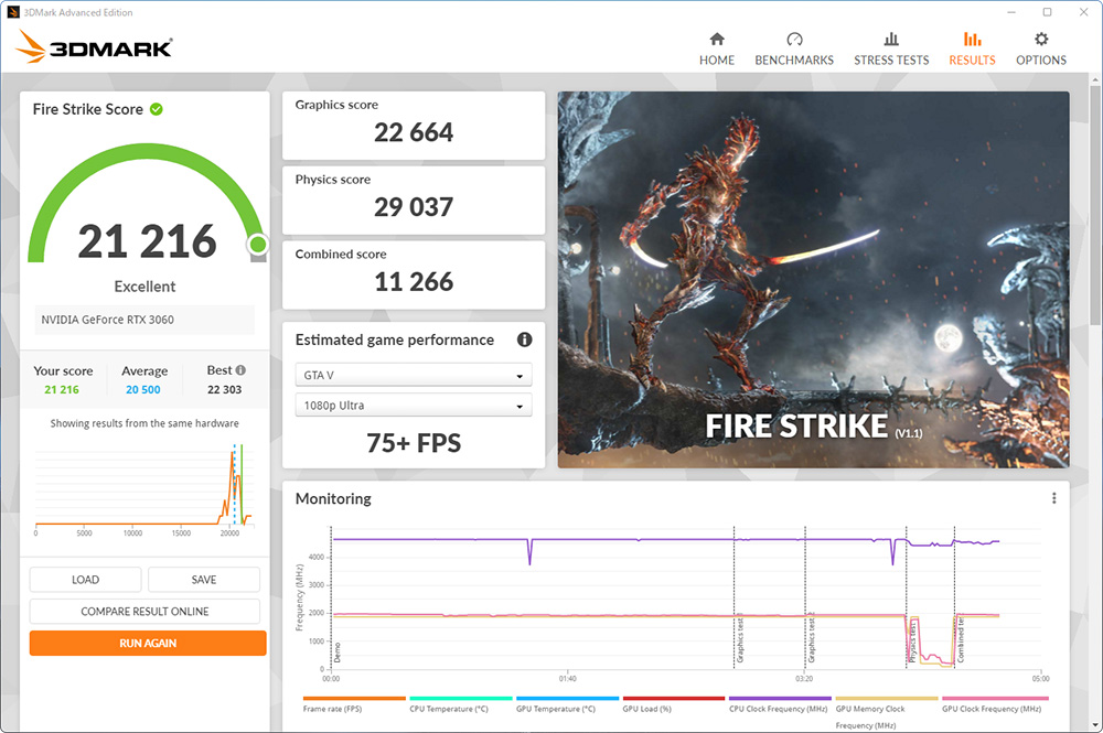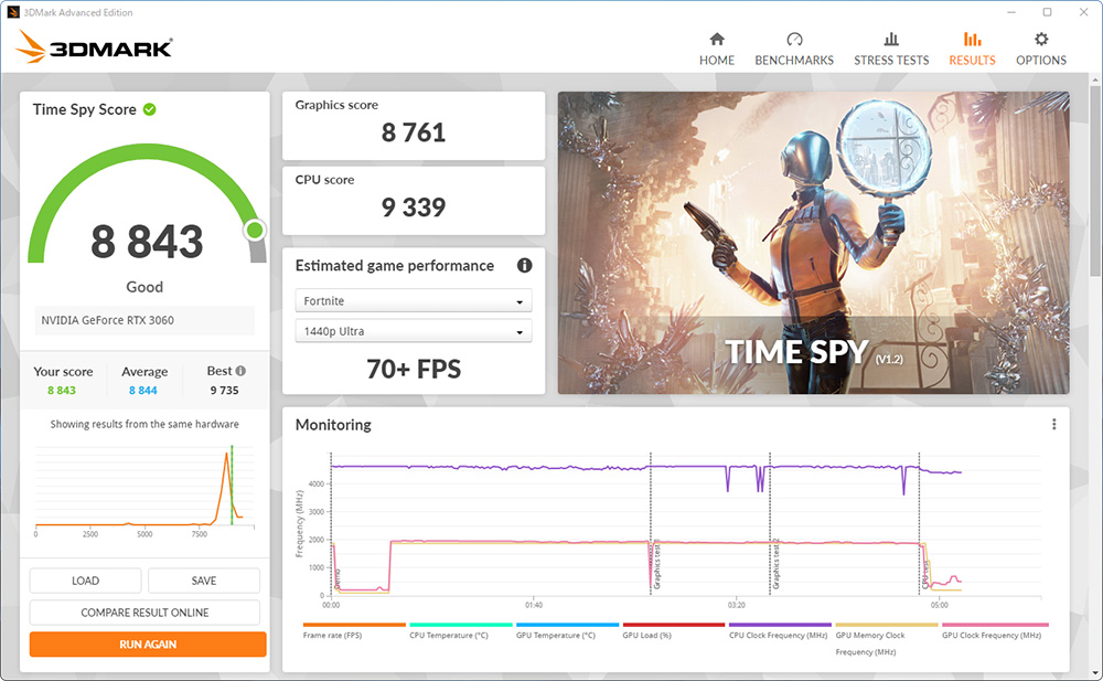 グラフィック性能をチェックするベンチマークプログラム「3D Mark」を実行すると、「DirectX 11」対応ゲームを想定した「Fire Strike」で21216、「DirectX 12」対応ゲームを想定した「Time Spy」で8843を記録。これは、オープンワールドゲーム「Grand Theft Auto V」がフルHD(1920×1080)/最高画質で65fps以上、「Fortnite」がWQHD(2560×1440)/最高画質が75fps以上で遊べるほどのスコアだ