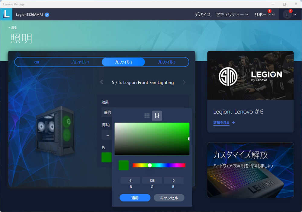 LEDライトは、ユーティリティソフト「Lenovo Vantage」から制御できる。ケース前面のロゴとケース内のLEDライトは、発光パターン(発光色はライトブルーのみ)と明るさを、CPUクーラーとリア/フロントのケースファンのLEDライトは発光パターンと明るさに加え、発光速度の調節が可能。ファンのLEDライトの発光色は約1677万色から選べる
