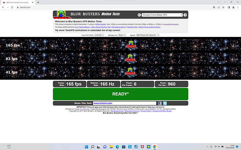 一般的なノートPCのディスプレイのリフレッシュレートは60Hzだが、「Legion Slim 770i」のディスプレイはその2倍以上となる最大165Hzという高速で画面の書き換えを行うため、表示がなめらか。リフレッシュレート測定サイト「Blur Busters UFO Motion Tests」でもチェックしてみたところ、165Hzで駆動することが確認できた