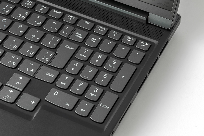 84キーの日本語アイソレーションキーボード。方向キーは、サイズが大きく位置も周囲のキーから少し下にずれているので、押し間違いが起きにくい。キーボード右側にはテンキーも備わっており、PCゲームだけでなく、表計算ソフトへの数値入力など普段の作業も快適にこなせるだろう