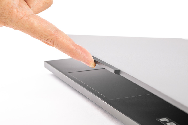 Webカメラ(1080p)はディスプレイ上部に装備。本体右側面にはWebカメラのカバーを開閉できるスライド式のスイッチも搭載している。ゲーム実況やビデオ会議でWebカメラを使う時以外は、このスイッチを操作してカバーを閉じておくことで、Webカメラから不用意に映像が流出することを防げるのだ。ソフトウエア的にWebカメラのオン/オフもできるが、やはり物理的にスイッチでオン/オフを切り替えられるのは心理的な安心感がある