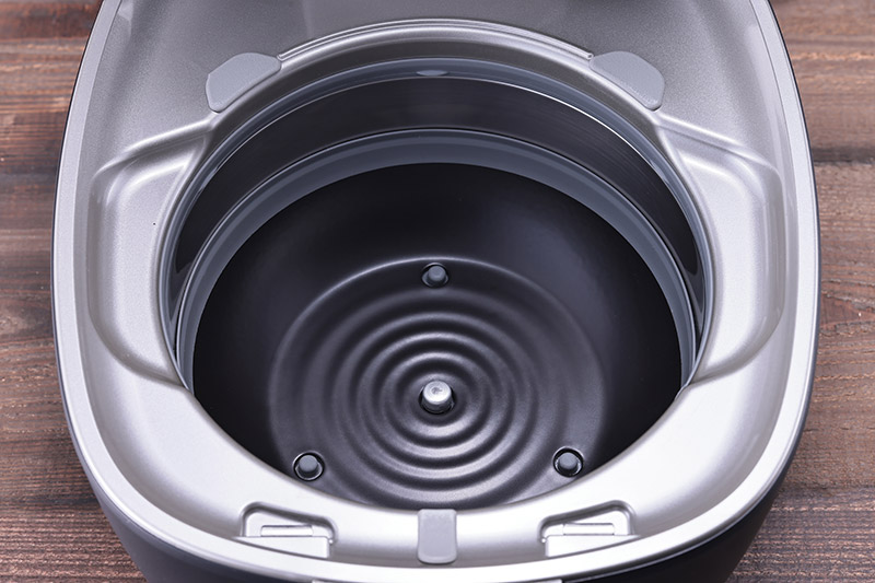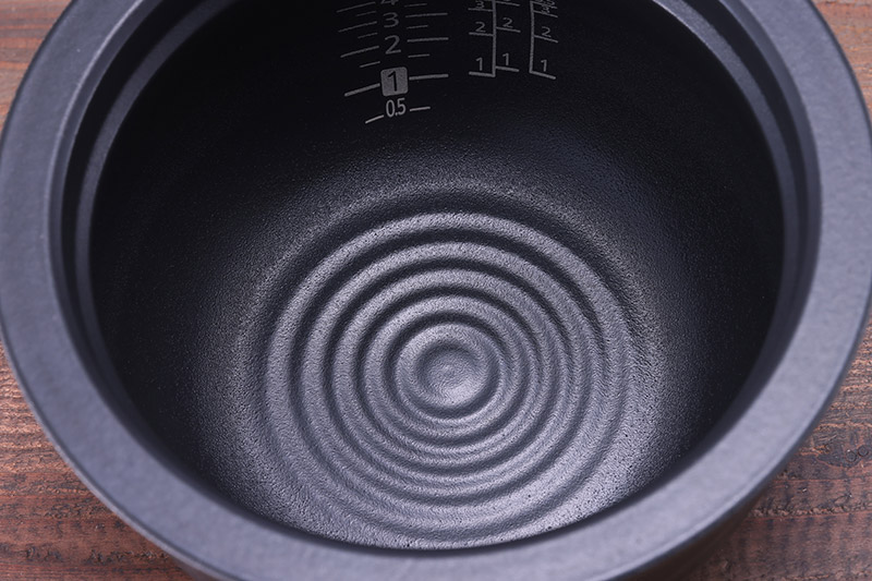 四日市萬古焼を採用した「本土鍋」と、それを包み込む本体底の「遠赤土かまど」。一般的な金属釜の最高温度は約130℃なのに対し、「本土鍋」の最高温度は約280℃にも達する。ここに土鍋の遠赤効果が加わることで、お米の内と外を均一に加熱し、甘みと粘りをムラなく引き出す。なお、タイガー魔法瓶では、「JPL-S100」における「本土鍋」の割れとフッ素コーティングのはがれを対象にした「内なべ5年保証」を用意。これだけ長期の保証を付けられるのは、内釜の強度と品質に対して絶対の自信があるからだろう