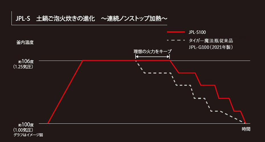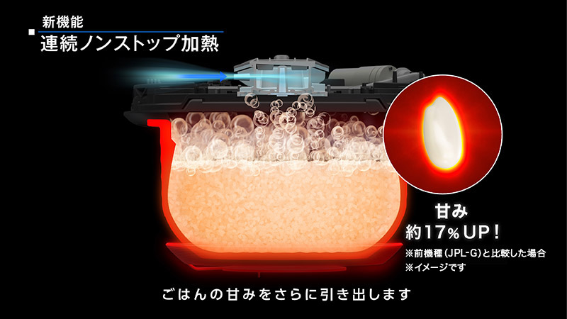 「連続ノンストップ加熱」は、本体に内蔵された「ハリつやポンプ」からの風を利用することで、ふきこぼれを抑え、かまどのように大火力で加熱し続けられるという新機能。内釜内の温度が約106℃(1.25気圧)の状態を、従来モデル「JPL-G100」より約1.5倍※長くキープできるようになり、お米の甘みと粘りをさらに引き出せるようになったという