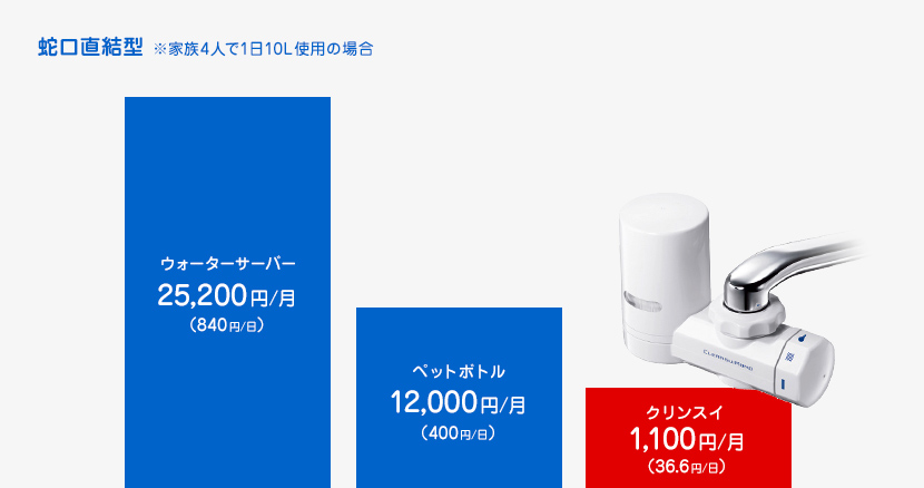 家族4人で1人あたり1日2L、炊飯や料理などで1日2Lの合計10Lを使用した場合の、1か月の料金を比較してみよう。一般的なウォーターサーバーが25,200円/月(840円/日)、ペットボトルのミネラルウォーターが12,000円/月(400円/日)なのに対し、定額制の「クリンスイのレンタル浄水器」は1,100円/月(36.6円/日)。ゼロがひとつ違うほどリーズナブルだ※価格はすべて税込