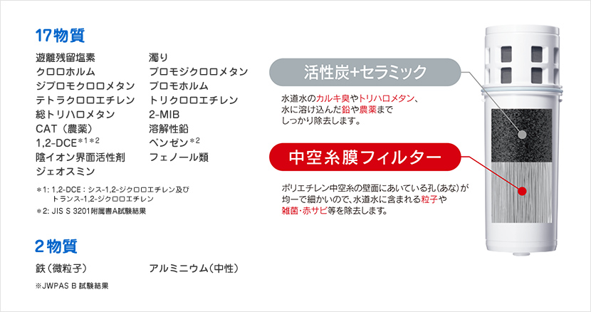 ポリエチレン中空糸の壁面には微細な孔(あな)が均一に空いており、水道水に含まれる雑菌や微粒子、赤サビなどを除去。ここに活性炭+セラミックを組み合わせることで、水道水のカルキ臭やトリハロメタン、水に溶け込んだ鉛や農薬までしっかり除去してくれる