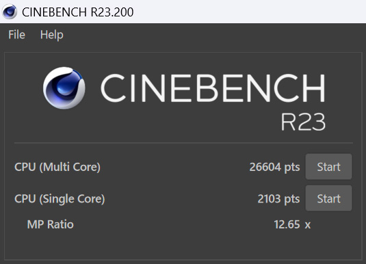 CPUの処理性能を計測するベンチマークプログラム「CINEBENCH R23」をテストすると、マルチコアで26604、シングルコアで2103をマーク。いずれもノートPCとは思えない、圧倒的なハイスコアだ