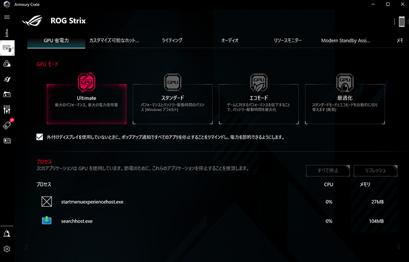 本機には、ディスクリートGPUからディスプレイに映像信号を直接伝達できる「MUXスイッチ」が搭載されているのも魅力。専用のユーティリティアプリ「Armoury Crate」でGPUモードを「Ultimate」にすれば、GPUのパフォーマンスを最大限に生かせる