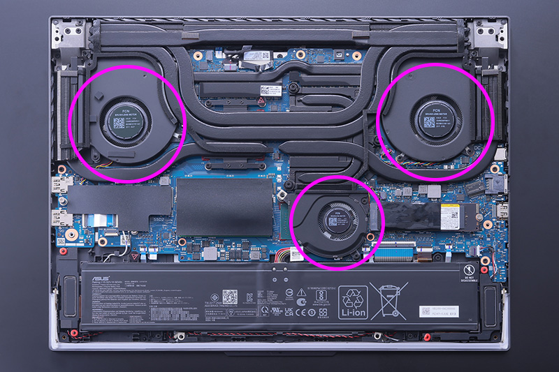 ノートPCのボディにこれだけパワフルなパーツを搭載できた理由として、ASUSが新開発した強力な冷却システム「Frost Forceテクノロジー」を抜きには語れない。一般的な冷却システムはファン1〜2基を搭載するに留まるが、この「Frost Forceテクノロジー」は、最大13%のエアフロー向上を遂げたパワフルな「Arc Flowファン」を3基搭載。さらに、7本のヒートパイプと巨大なフルワイドヒートシンクを備えることで、パワフルなCPUとGPUから発せられる熱をしっかりと外へ逃がし、パフォーマンスを限界まで引き出してくれるのだ。