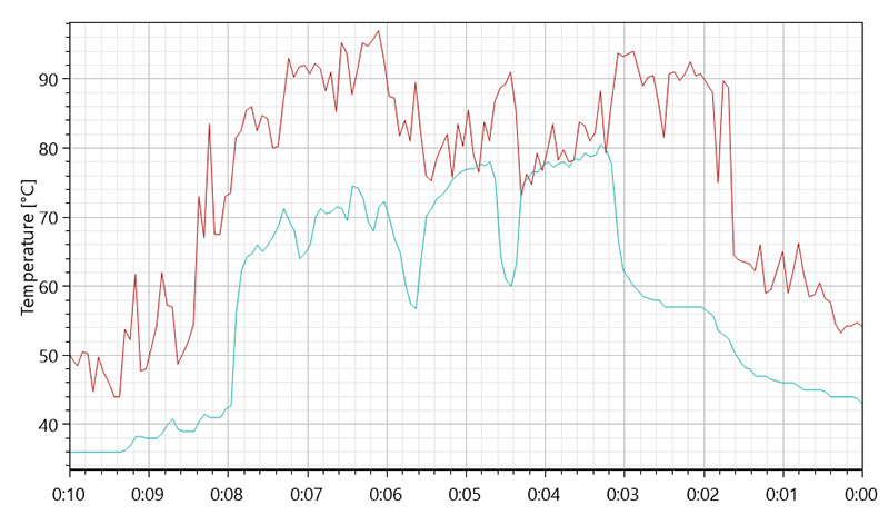 ベンチマークプログラム「3DMark」の「Time Spy」を実行中に測定した、CPU(赤)とGPU(緑)の温度グラフ。高負荷時でも、CPUは90℃台前半、GPUは70℃台後半に留まっており、いずれも上限温度以下でフル稼働できている