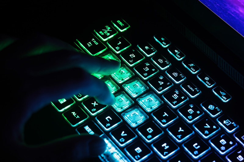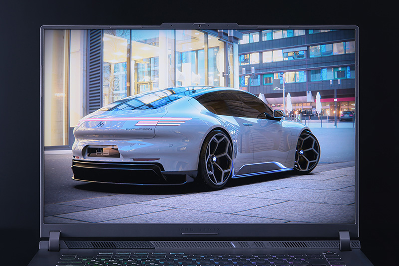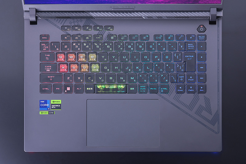 「ROG Strix G16シリーズ」の最上位モデル「G614JZ-I9R4080」。「エクリプスグレー」のボディをオーロラのように彩る鮮やかなRGBイルミネーションは、ゲームにおける闘争心を奮い立たせてくれる