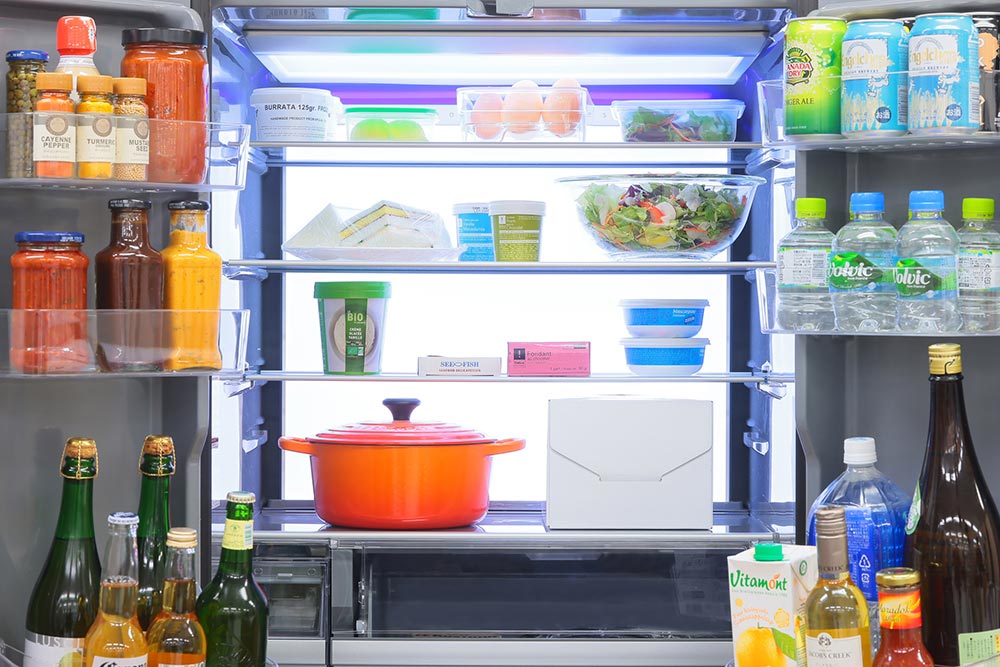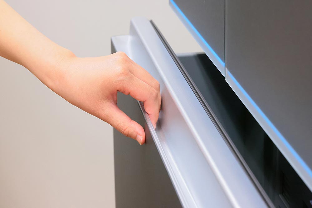 また、本機には人感センサーで人の動きを検知し、冷蔵庫に近づくと運転状況を光で知らせる「LEDステータスバー」が搭載されているのも特徴のひとつ。インジケータとしての役割を果たすだけでなく、先進的なデザインを完成させる要素のひとつとしても寄与しており、デザインと機能性が両立されていることがわかる。握りやすく掃除しやすいハンドルデザインを含めて、キッチンのインテリアにこだわる人も納得のデザインと言えるだろう。