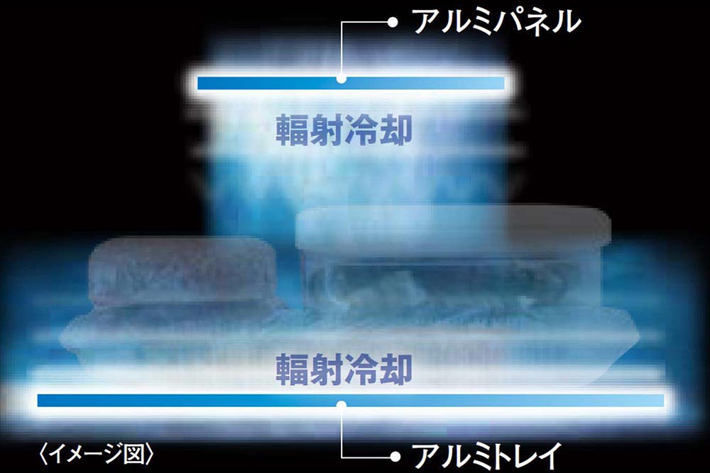 冷蔵室内下部のチルド室には、上部のアルミパネルと下部のアルミトレイの輻射冷却効果により、食材のおいしさをキープする「W間接冷却チルド」を搭載。肉、魚介類、ハム、チーズ、かまぼこ、ちくわなど、さまざまな食材の乾燥を抑制し、おいしさを長持ちさせられる