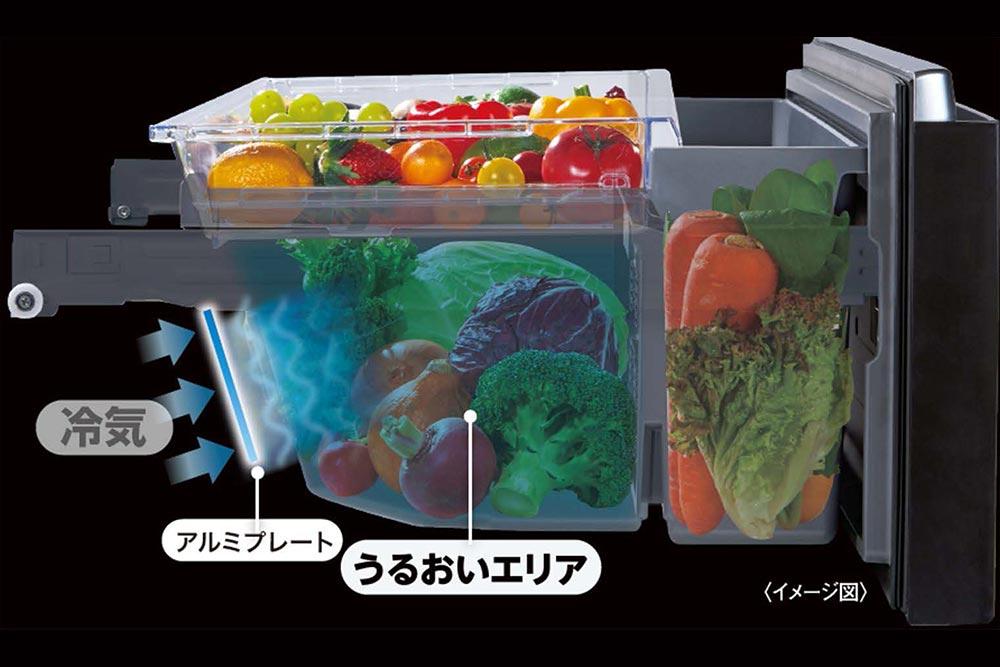 半密閉構造とアルミプレートの輻射冷却効果により、野菜のうるおいと鮮度を守る「うるおいエリア」を備えた野菜室。傷みやすい葉物野菜もシャキシャキとした歯応えを保つとともに、ビタミンCなどの栄養素の残存率も高いのが特徴だ