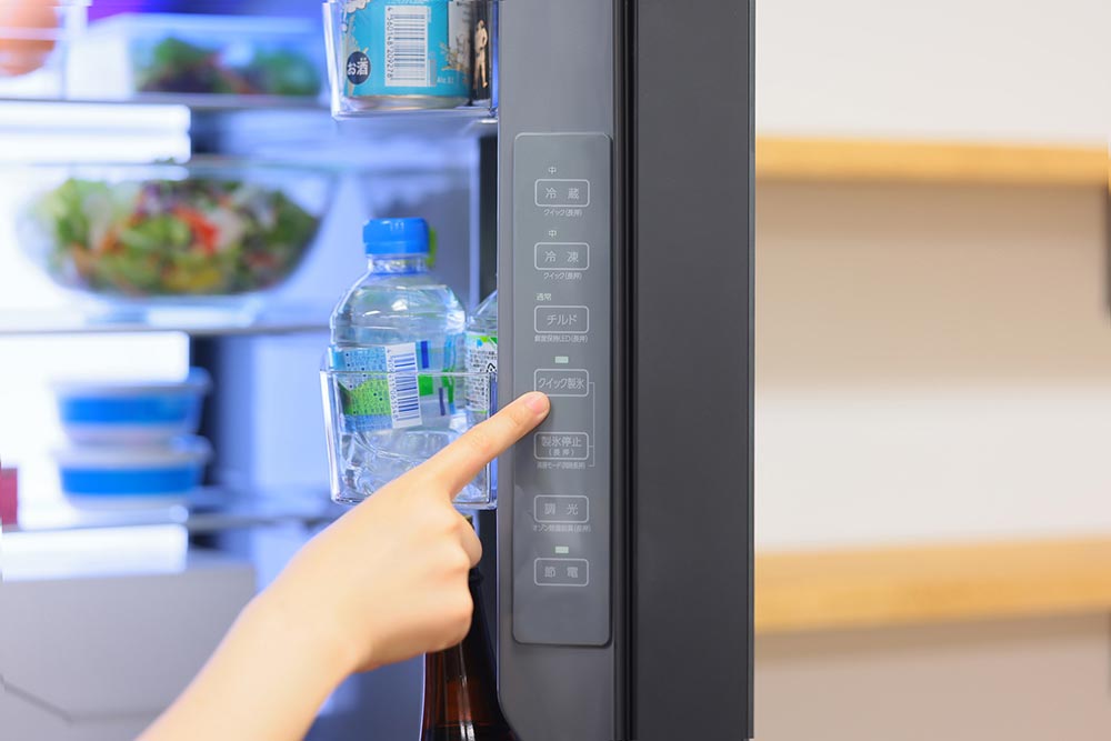 各種モードの切り替えボタンは冷蔵室のドア側面に集約されている。一般的な冷蔵庫の場合、冷蔵室の側面の壁にボタンが並んでいることが多いが、収納した食材で操作がしづらかったり、各ボタンの機能表示が読みにくかったりと、使いづらいこともしばしば。ドア側面にボタンが並ぶ設計は、なるほど、理にかなっている