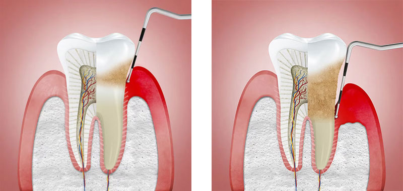 歯周病の初期段階なら、歯と歯ぐきの隙間(歯周ポケット)は4〜5mm程度(写真左)。進行すると、6mm以上で重度の歯周病となり、歯を支える骨は溶けていく(写真右)。ちなみに、この2枚のイラストの歯の左側は、軽度な歯周ポケット