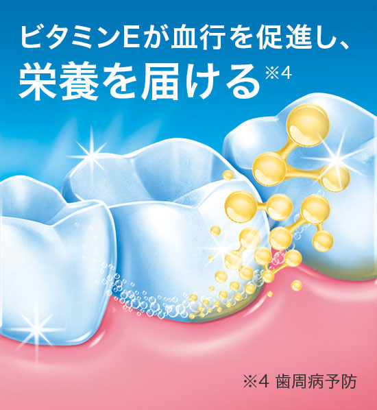 さらに、日本版である本製品ならではのオリジナル処方として「ビタミンE」を配合。キレイになった歯ぐきの血行を促進し、歯周組織に栄養を届けて、歯周病を予防してくれるのだ。