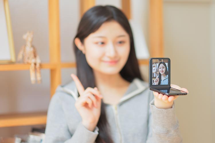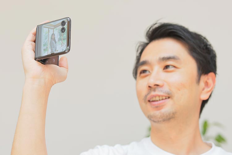 アウトディスプレイとアウトカメラの組み合わせはセルフィーでも有効だ。卓上に置いてフリーハンドで自撮りできるし、手のひらにも安定して置ける。メインディスプレイを90度に折り畳んだハンディカムスタイルも撮影が行いやすい。こういった点は、「motorola razr 40 ultra」だけで味わえる折りたたみスマートフォン体験だ。