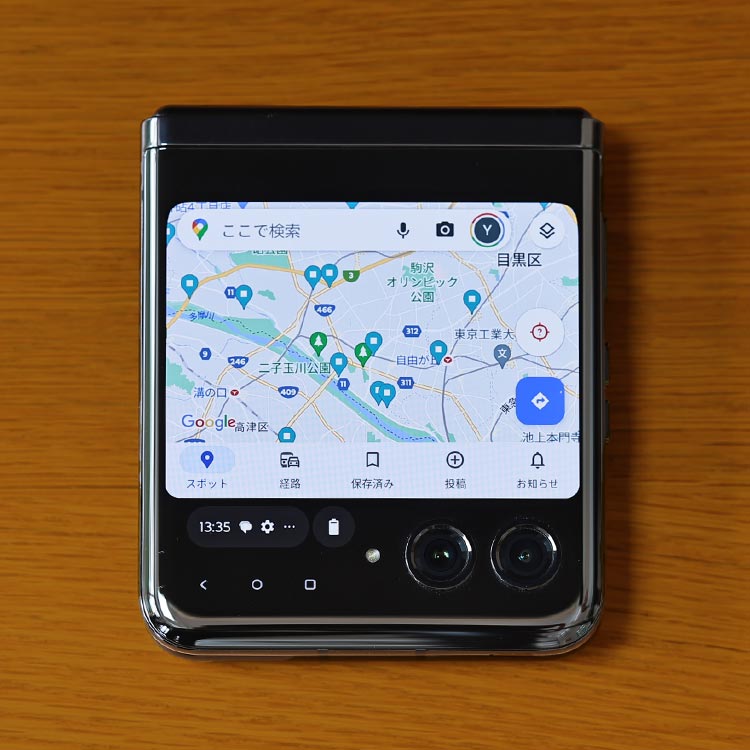 その点、「motorola razr 40 ultra」はアウトディスプレイだけで、メッセージやメールの確認・返信や、Googleマップのナビ、Spotifyなど音楽アプリの操作、PayPayなど決済アプリでの支払い、音声通話、スケジュールや時刻の確認などがこなせる。端末を開くほどでもない軽い操作をアウトディスプレイでサクッと済ませられるのは、非常にスマートな使い心地だ。さらに、本来サブであるアウトディスプレイのリフレッシュレートは最大144Hz。ハイエンドスマートフォンのメインディスプレイに匹敵する非常に滑らかな動作を実現している。