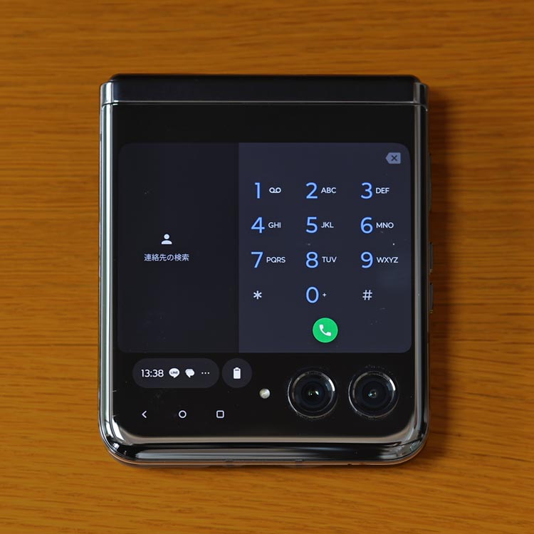 折りたたみスマートフォンで気になるのはヒンジ部の耐久性だろう。その点に関して、本機ヒンジ部は、メインディスプレイにしわが付かないように再設計され、高い耐久性も実現。また、メインディスプレイを閉じると上端と下端がピタリと揃うのも美しい。モトローラの技術力ならではの洗練されたヒンジ機構だ。