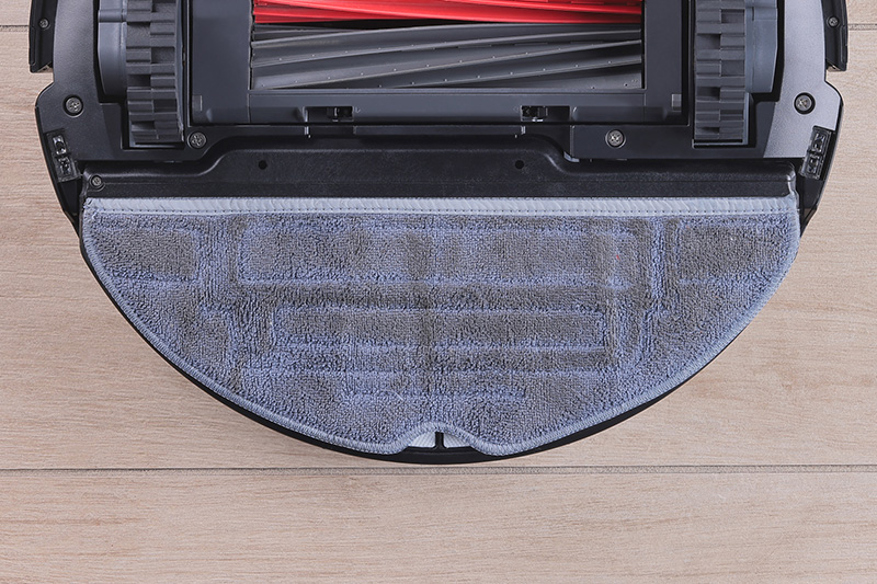 モップ自動洗浄は、ドックの底部に搭載されたローラーが高速回転して、ロボット掃除機本体に装着されたモップの汚れを落とすというもの。約77m2のフロアを清掃した後のモップは全体が茶色く汚れていたが、自動洗浄後、ここまでモップがキレイになった。これなら、モップ洗浄もロボットに任せておける