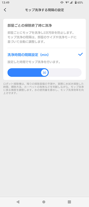 専用のスマートフォンアプリ「Roborockアプリ」(Android/iOS対応)を使えば、水拭き清掃中のモップ洗浄間隔や乾燥時間の調節が可能。洗浄間隔は10〜50分まで5分刻みの9段階、乾燥時間は2/3/4時間の3段階で調節できる。水拭き掃除の途中でこまめにモップを洗浄したい場合は洗浄間隔を短くしたり、季節に応じて乾燥時間を最適化したりなど、状況に合わせて設定しよう