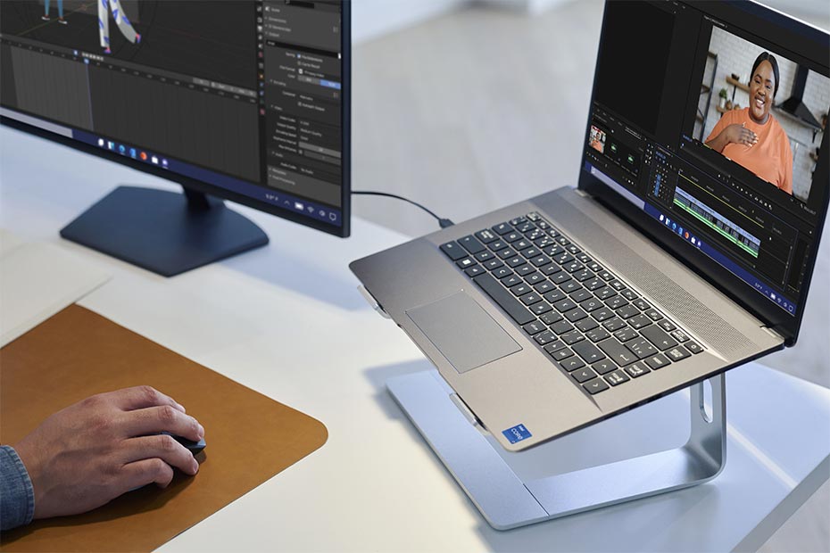 ちなみに、「インテル® Evo™ プラットフォーム」の前提条件となっているのは、高性能CPU「インテル® Core™ プロセッサー・ファミリー」の搭載。とりわけ注目したいのは、最新世代の「第13世代インテル® Core™ プロセッサー・ファミリー」を搭載した製品だ。この最新世代CPUは、高性能な「Pコア」と省電力な「Eコア」の2種類で構成される「パフォーマンス・ハイブリッド・アーキテクチャー」を最適化。動作クロックの向上が図られているうえ、増強されたEコアによってマルチコア処理にもめっぽう強い。そのため、動作クロックやマルチコア処理が肝となる動画のエンコードやレンダリングなどの本格クリエイティブ作業も、サクサクとこなせるのだ。
