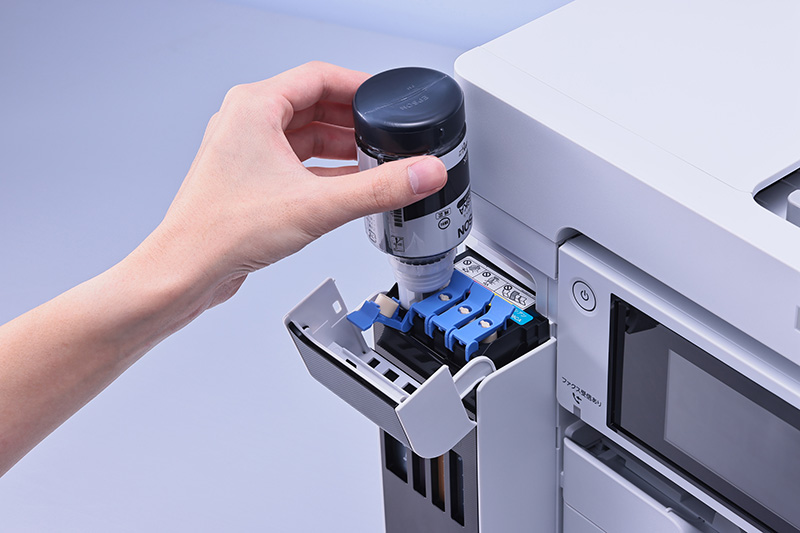 エコタンク搭載の「PX-M6712FT」は、インクボトルからインクを充填する仕組み。「挿すだけ満タン」インク方式を採用しており、タンクの注入口にインクボトルの先端を合わせて、軽く押し込むだけで簡単にインクを充填できた。インクボトルは、ブラック、マゼンタ、イエロー、シアンの4色が用意され、ブラックインク1本あたりでA4モノクロ約7,500ページ、カラーインクはA4カラー約6,000ページの印刷が可能なため、インク交換の手間が軽減される