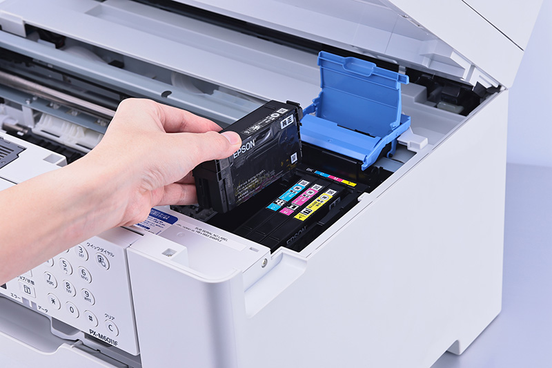 カートリッジモデルの「PX-M6011F」のインク交換は、古いカートリッジを外して、新しいカートリッジをカチッとはめ込むだけ。「PX-M6712FT」と同様、インクはブラック、シアン、マゼンタ、イエローの4色を使用する。なお、大容量インクカートリッジ使用時ならA4モノクロ約2,200ページ、カラーインクはA4カラー約1,100ページの印刷が可能だ