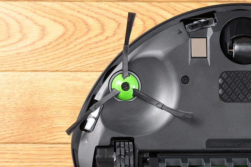 一般的にロボット掃除機は丸型が多い。丸型に対し、「部屋の壁際や隅のゴミは取り除けるの?」と不安を覚える人は少なくないはずだが、「ルンバ」においてはご安心を。本体前方で高速回転する「エッジクリーニングブラシ」(写真上)が部屋の壁際や隅のゴミを漏らすことなくかき集め、本体底面中央に配置された「デュアルアクションブラシ」(写真下)がしっかりと吸引する